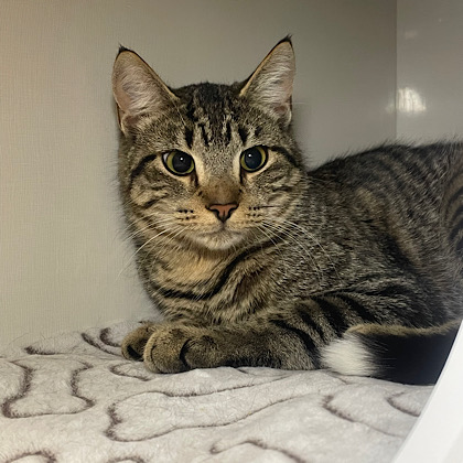 This sweetheart is Fairfield, he is a 1 year old, he is a very friendly cat, he is unfortunately missing part of his tail and we do not know why, he is good with other cats, can be a little bit scared at first but he is a very affectionate boy.