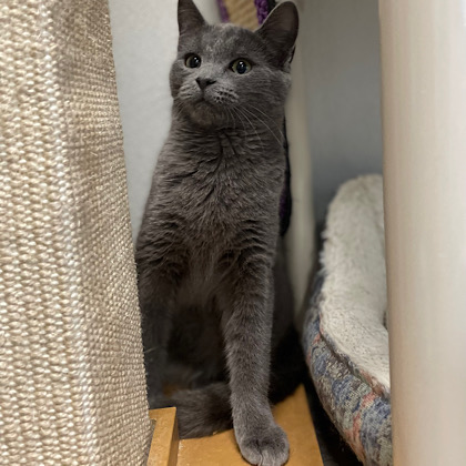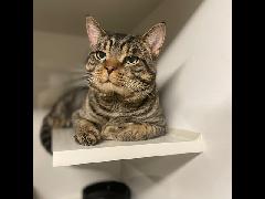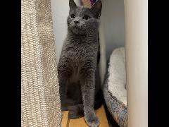 This adorable guy is Gord, he is 2 years old, despite his perpetually grumpy face he has a little baby meow and loves to be held in your arms for pets, and he loves attention!