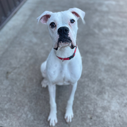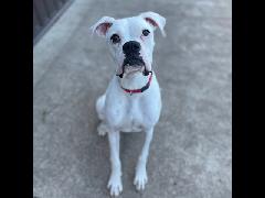 Our sweet boy Onyx is looking for a forever home! He is 3.5 year old dogo argentino, he is a really sweet dog, good with other dogs, great with kids, not good with cats, or men sometimes but he loves women, chicken also does not sit well with him.
