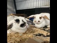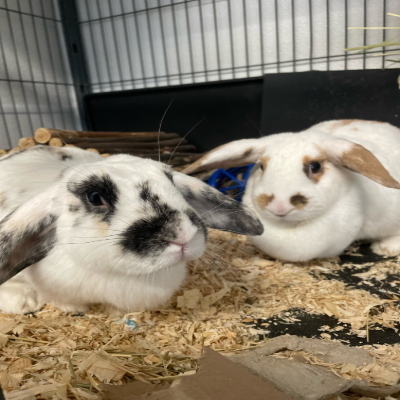 These cuties are Daisy and Maisy! They are 1 year old Holland Lop rabbits, they are super playful. They are a bonded pair and we would prefer to have them adopted together.